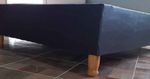 Base de madera reforzada tapizada en laterales en ecocuero, tiza o negro [a eleccion], lleva 6 patas de madera torneadas y laqueado o pvc según disponibilidad [no a eleccion]
