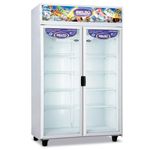 Exhibidora vertical. Con cenefa. Condensación forzada. Controlador inteligente con indicador de temperatura. Dos puertas. Ocho estantes móviles. Reja de piso.