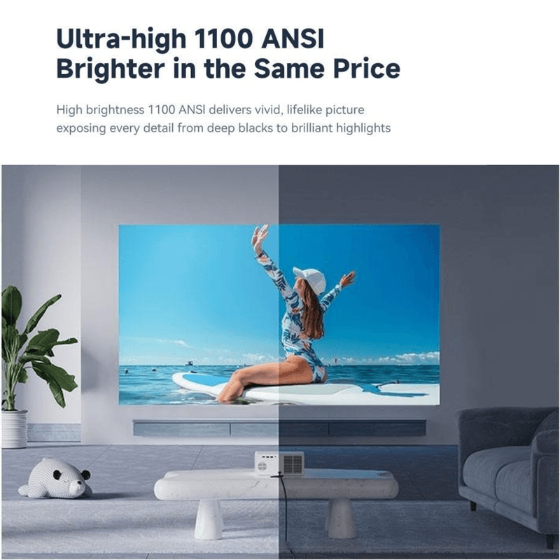 Con 1100 lúmenes ANSI, garantiza proyecciones claras incluso en ambientes con luz natural, siendo perfecto tanto para uso hogareño como para oficinas o salas de reuniones.