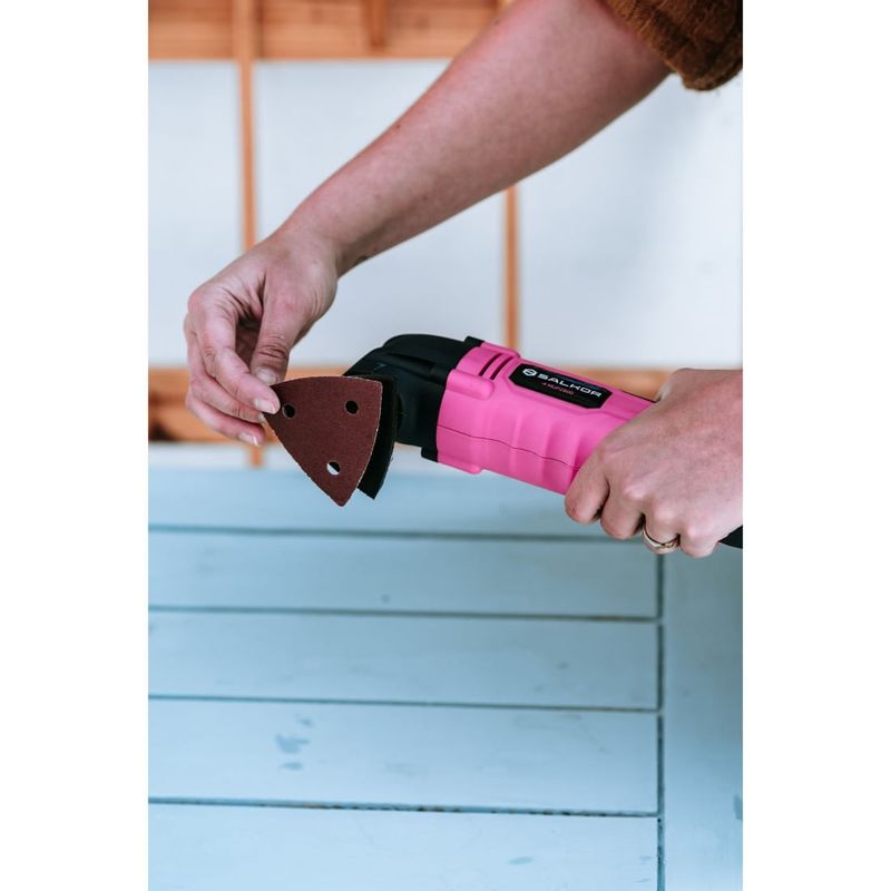 Para trabajar en madera, plásticos, yeso, metales no ferrosos y elementos de fijación (clavos, grampas, etc.) Además, sirve para trabajar en azulejos y en paredes blandas, así como para lijar y raspar pequeñas superficies.